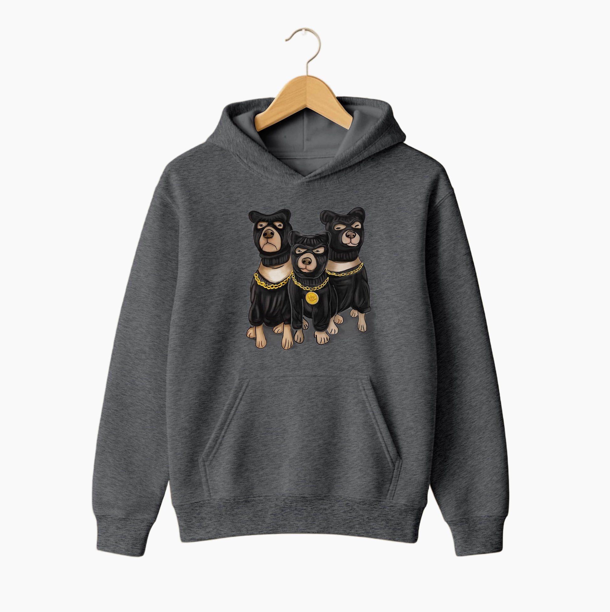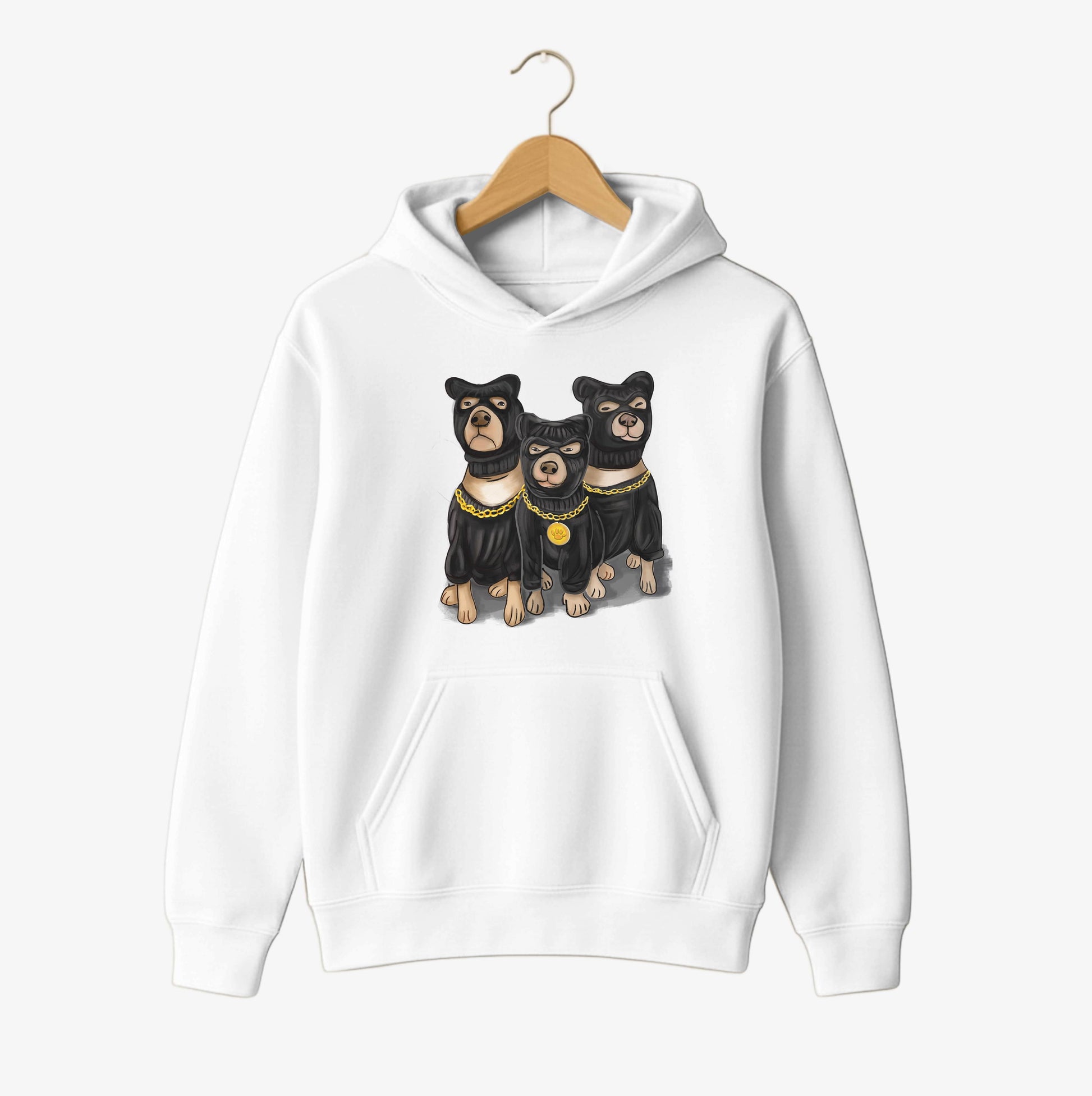 A striking hoodie featuring three tough, masked dogs with gold chains — the perfect blend of humour, street style and dog-lover attitude. Warm, durable and perfect for anyone who loves bold, standout designs.