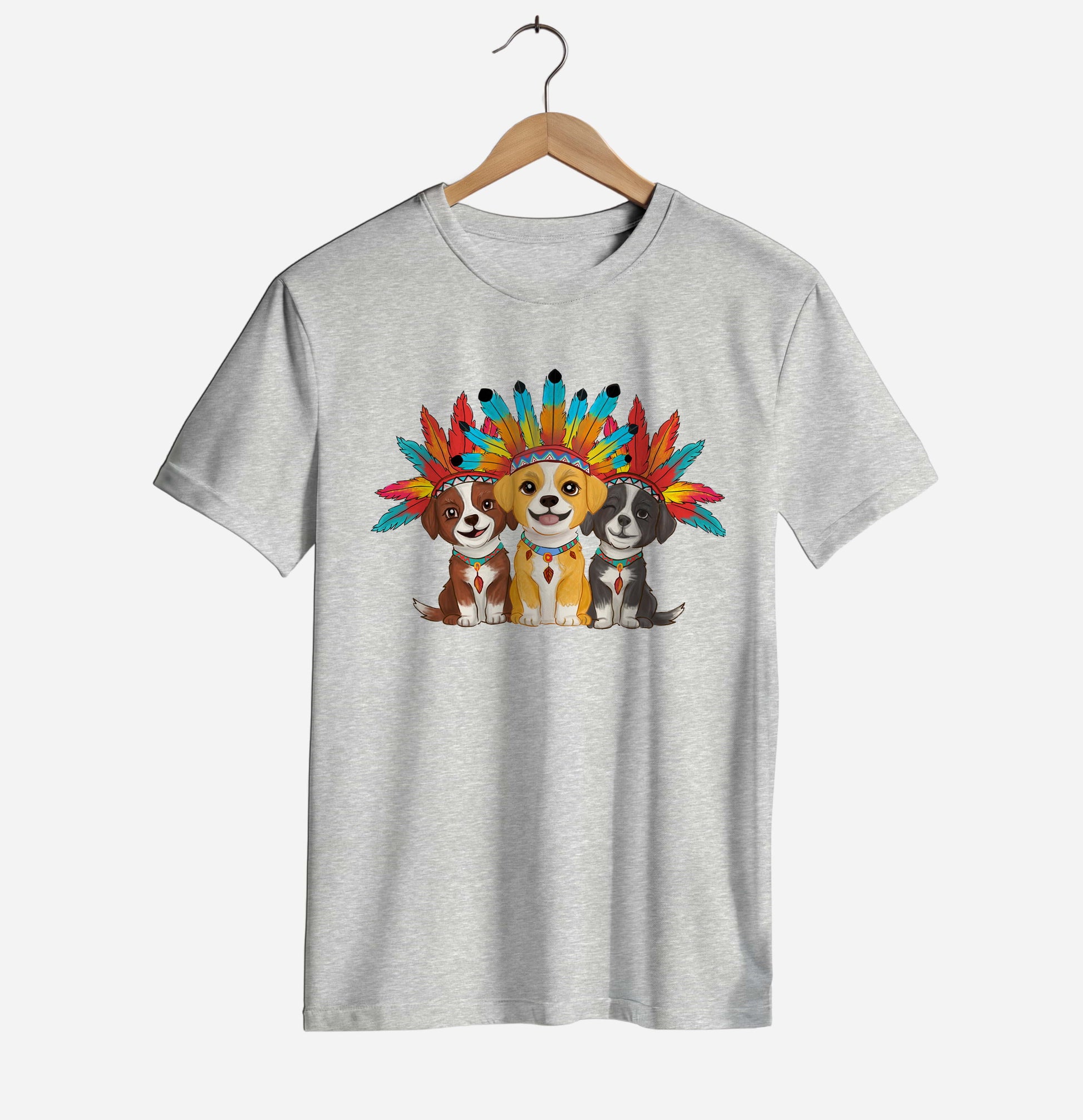 A vibrant and cheerful illustration featuring three adorable pups wearing colourful boho-style feather crowns. This design brings a warm, artistic and playful vibe to any dog lover’s outfit, making it perfect for gifting, festivals or casual everyday wear.