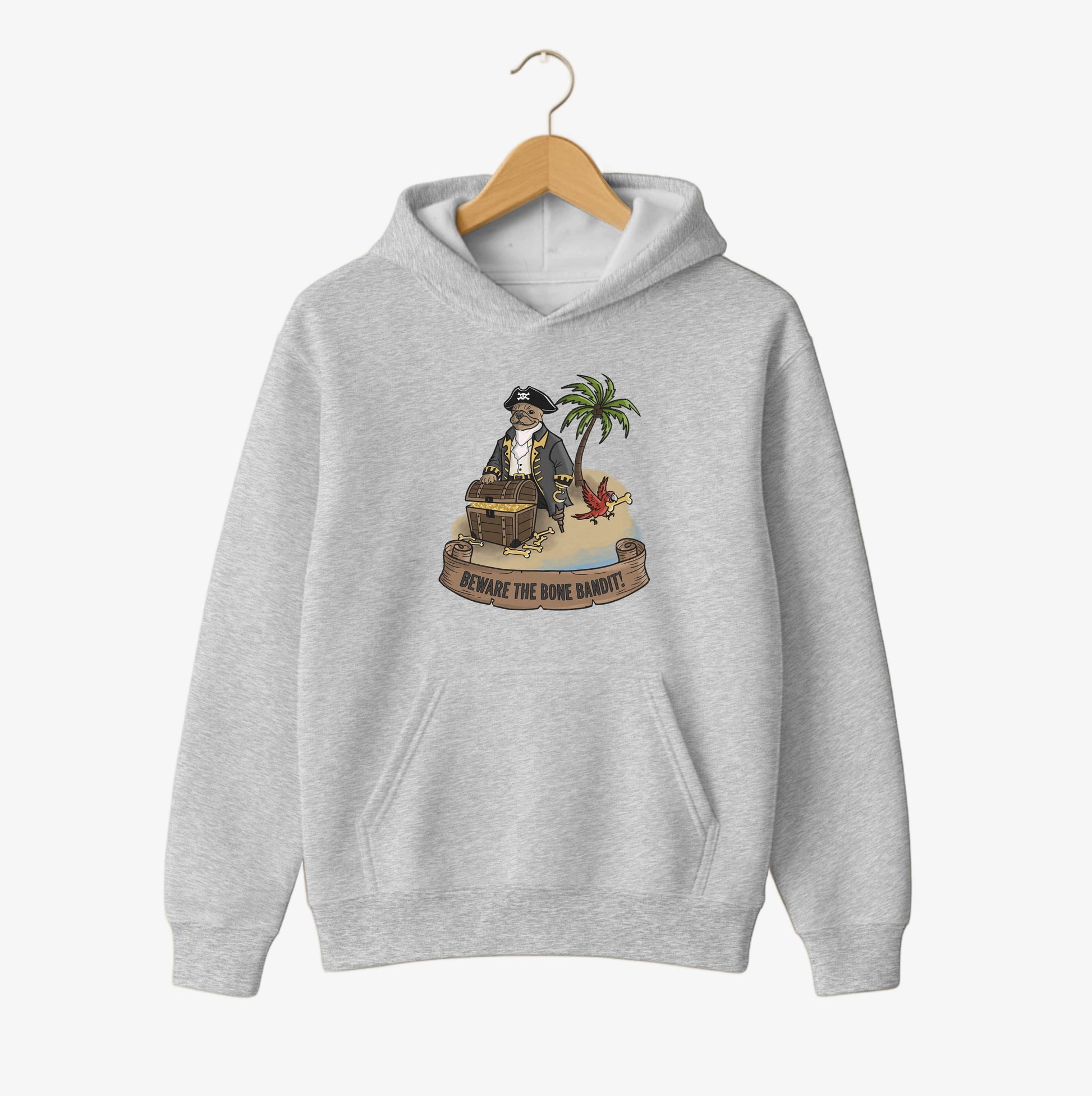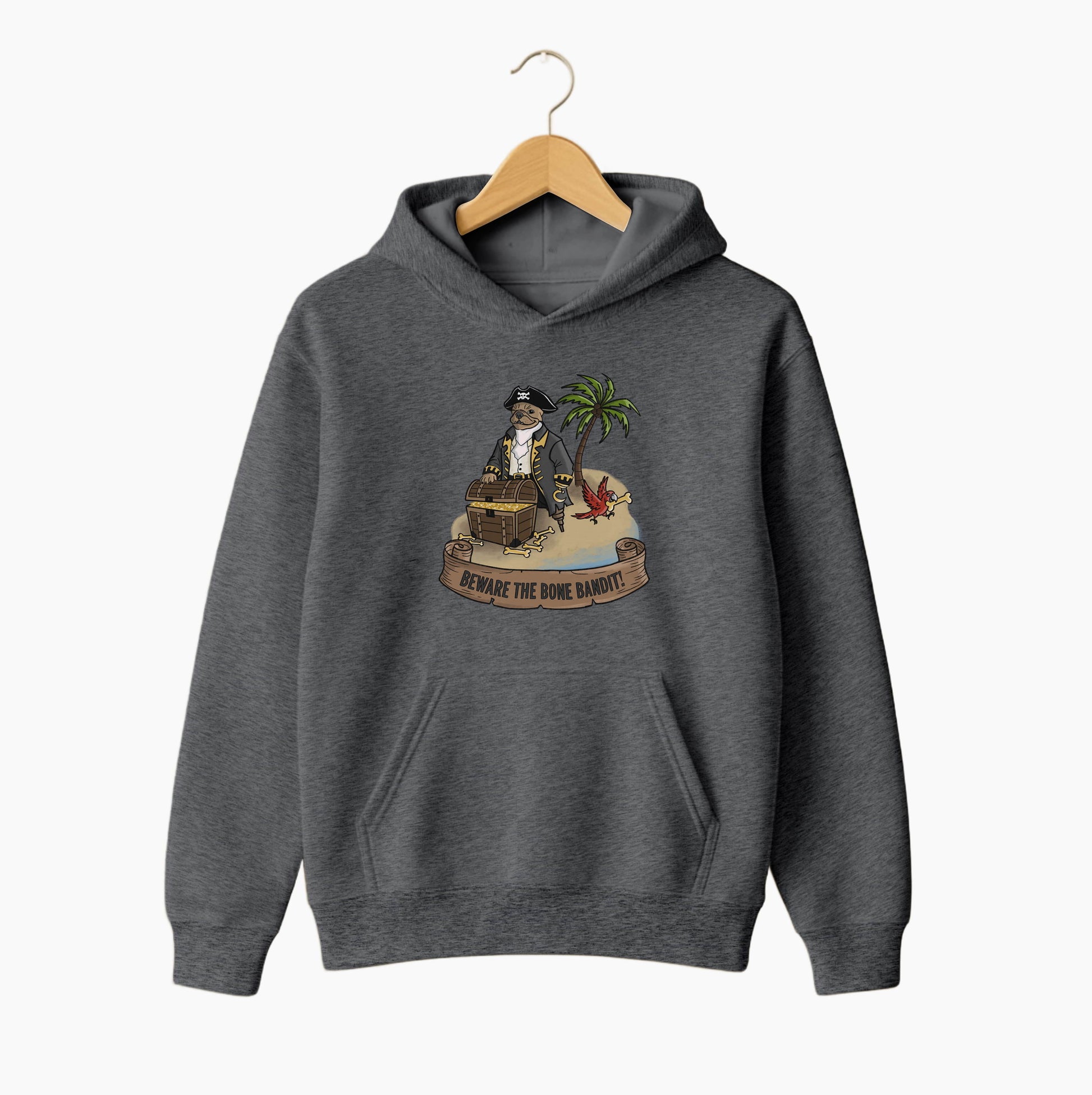 Stay cozy with this playful pirate-dog hoodie. The design shows a confident canine pirate guarding his golden treasure, while a mischievous parrot snatches a bone and takes flight. Warm, comfortable, and full of charm—perfect for fans of dogs, pirates, and unique statement hoodies.