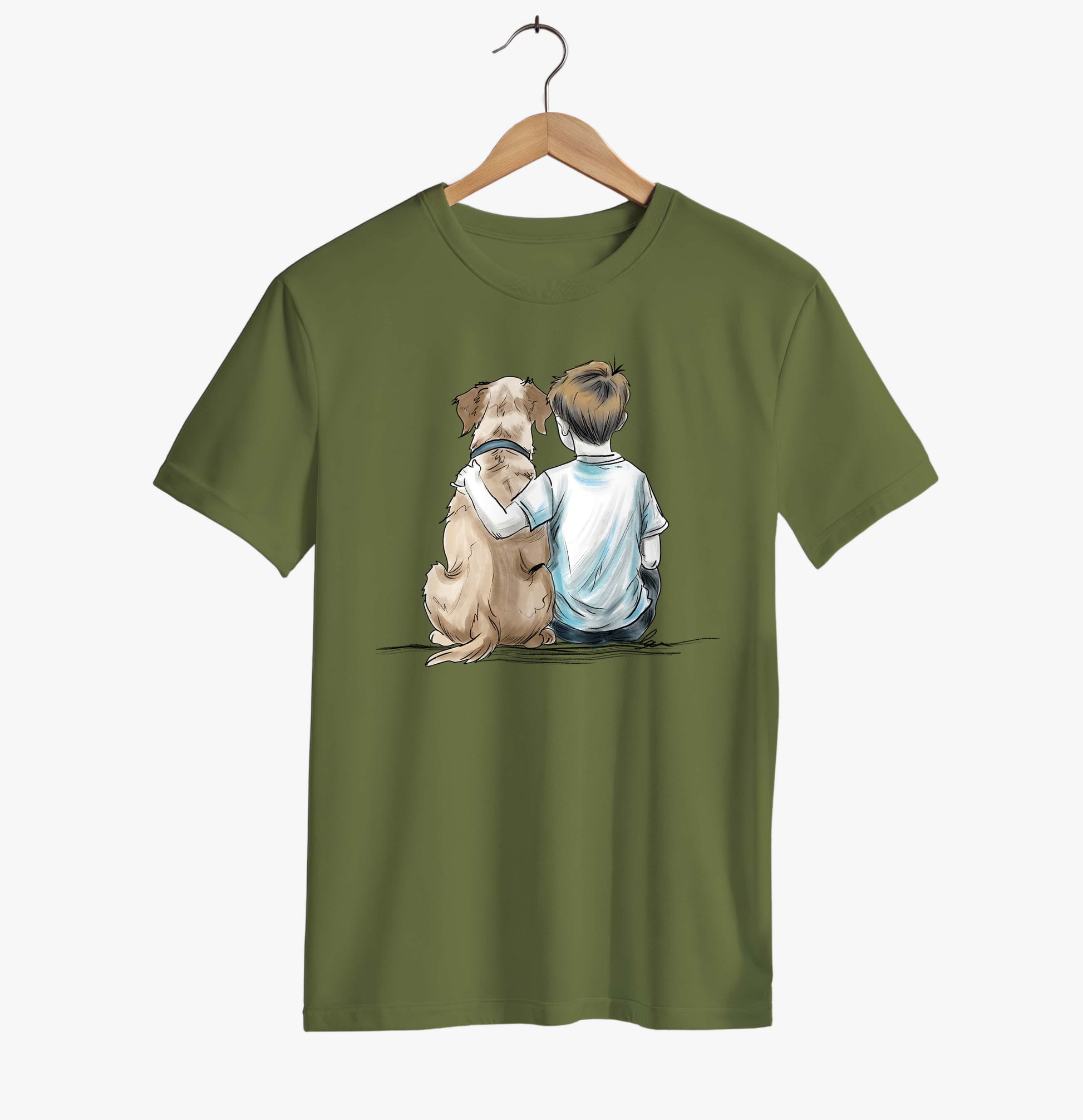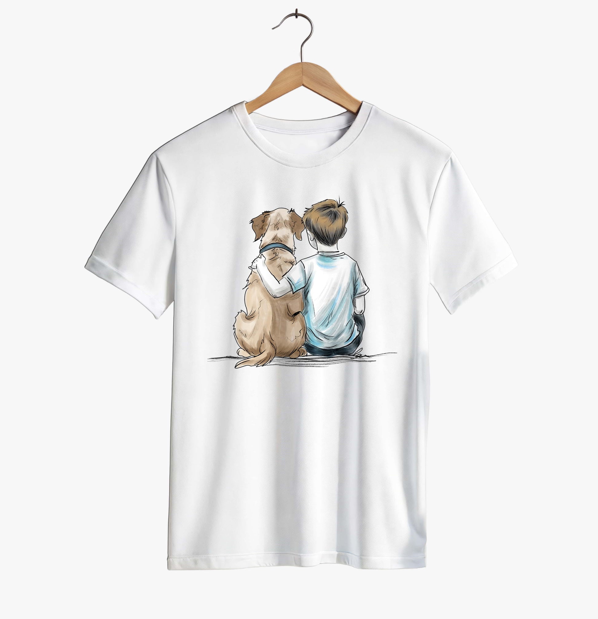 This unisex T-shirt features a soft, emotional illustration of a boy sitting side by side with his dog, arms around each other, sharing a quiet moment of companionship.