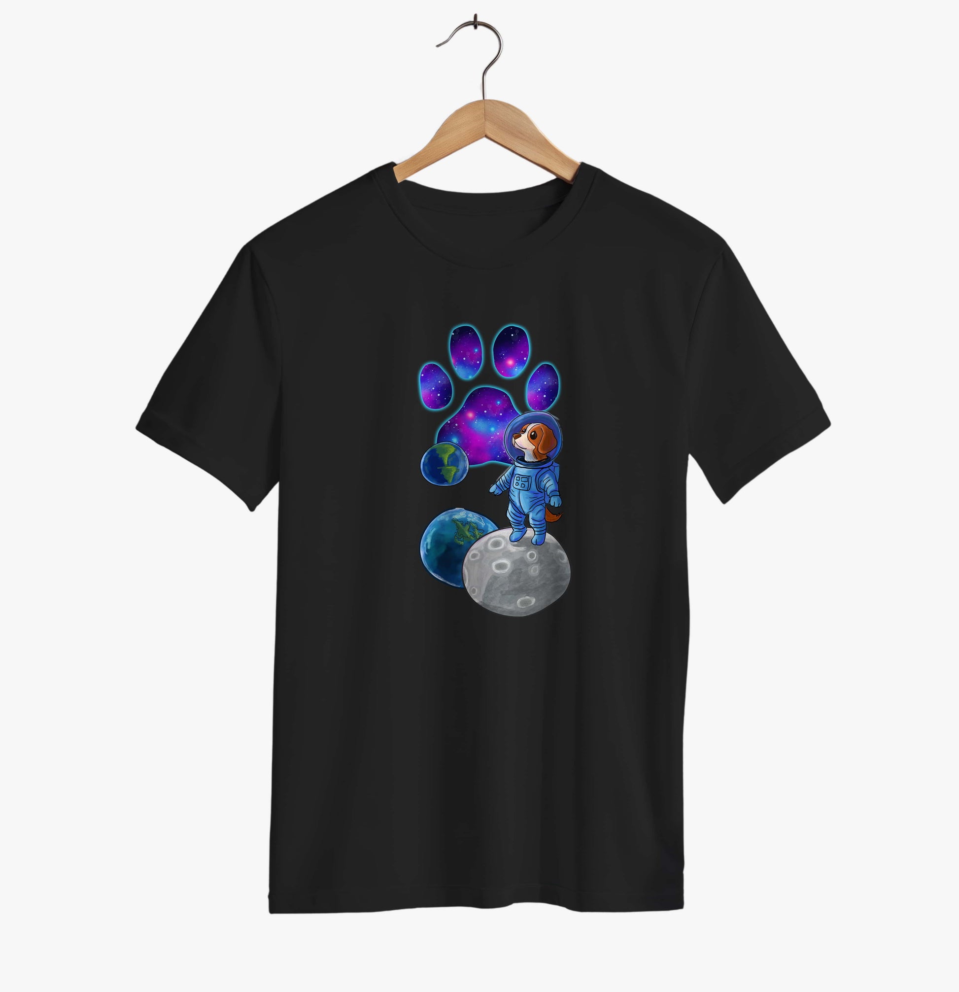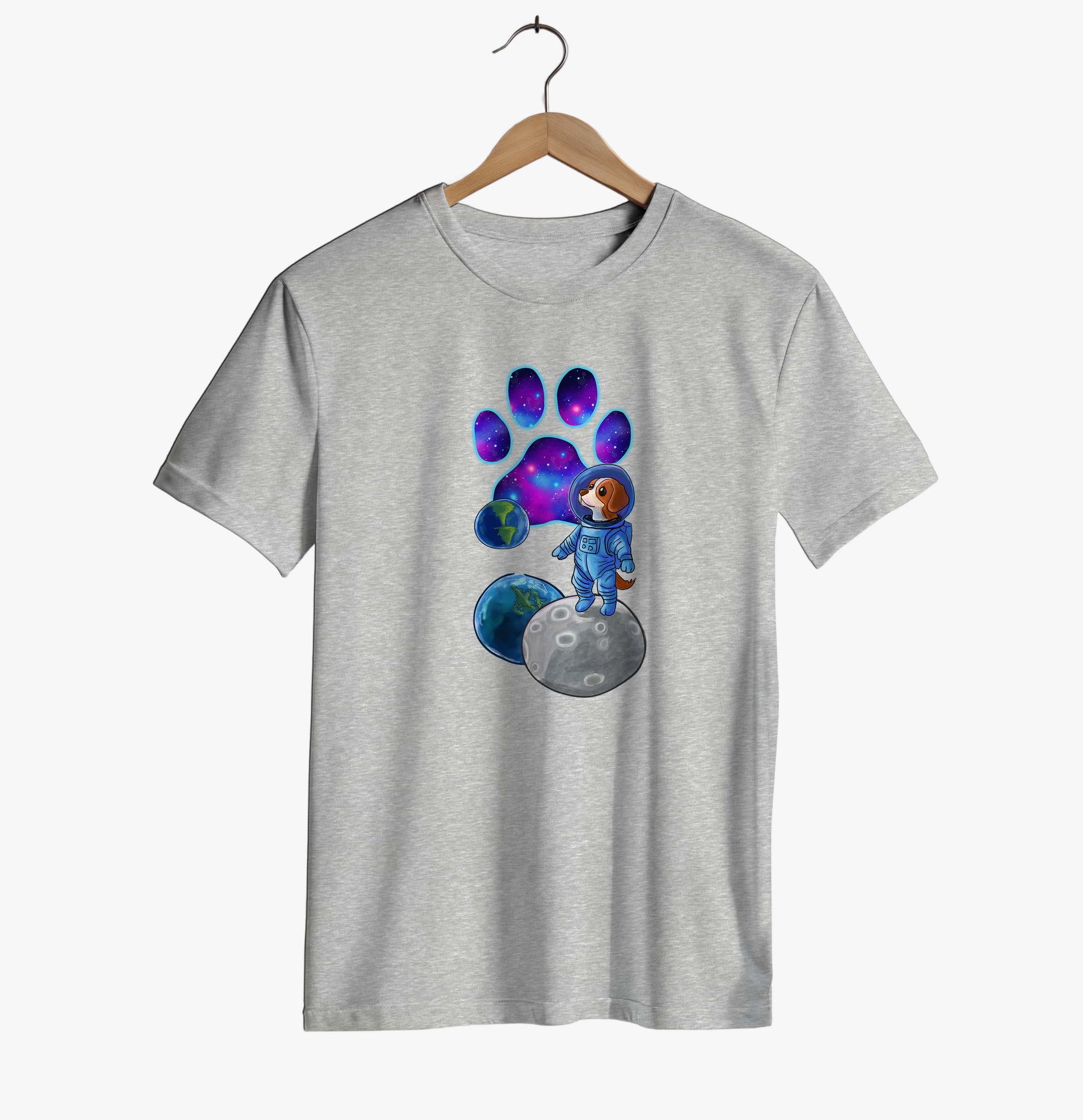 This unisex tee brings cosmic charm to life with an adorable astronaut dog standing on the moon, surrounded by planets and a glowing galaxy paw print. The design blends adventure, colour and fantasy, making it perfect for dog lovers who enjoy space-themed artwork and playful, imaginative illustrations.