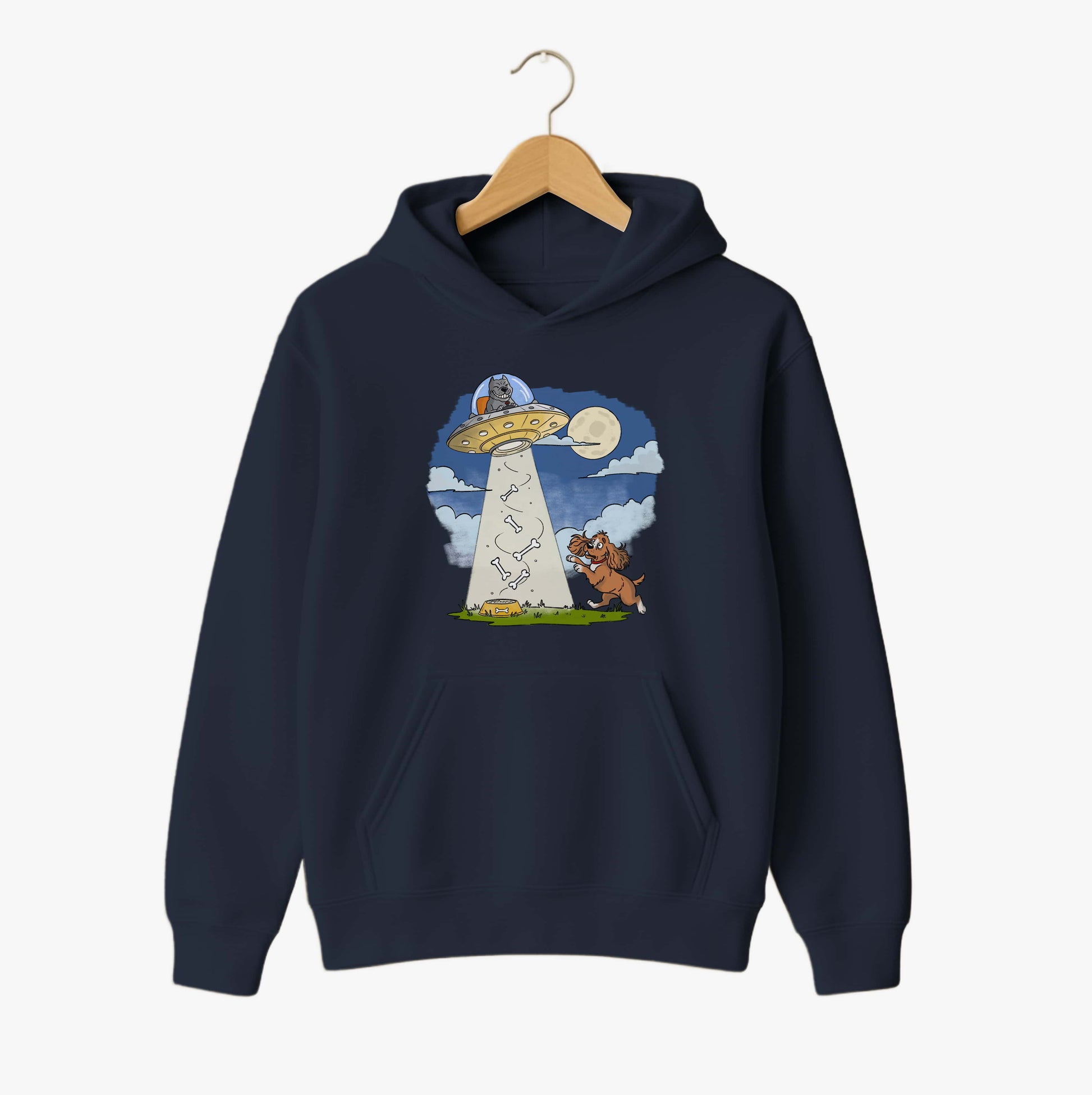 A cozy hoodie with a fun, space-inspired dog design. The artwork shows a smiling pup flying a UFO and sending down a beam filled with bones to a dog eagerly waiting below. Warm, comfortable, and full of personality—perfect for chilly days, casual outfits, and anyone who loves dogs with a sense of humor!