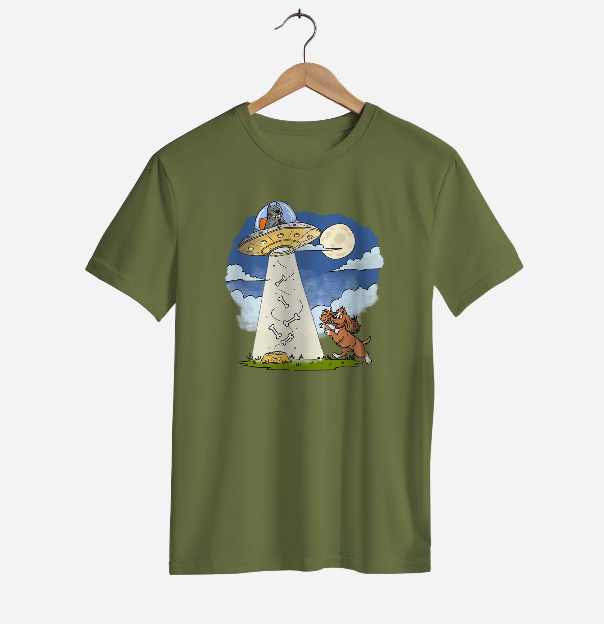 A playful cosmic design for every dog lover. This t-shirt features a happy pup piloting a UFO and beaming down a stream of swirling bones to an excited dog on the ground. Fun, eye-catching and perfect for daily wear, dog walks, or as a unique gift. Printed on the soft, premium Bella+Canvas 3001 for comfort and long-lasting quality.
