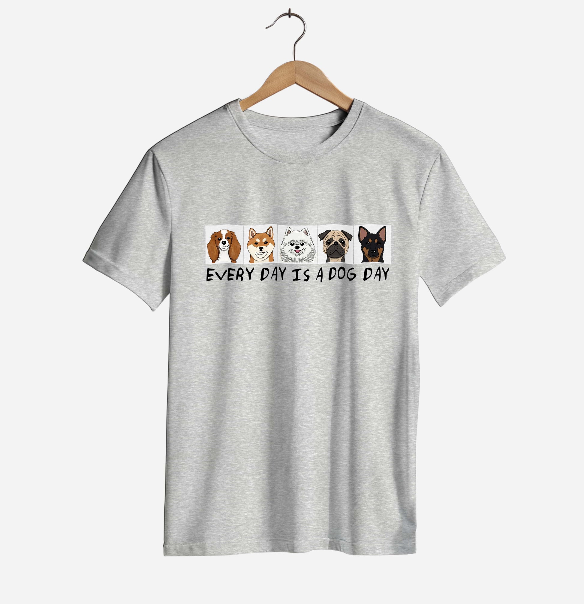This unisex T-shirt celebrates one simple truth: every day is better with dogs. Featuring a lineup of adorable dog illustrations and a playful hand-drawn slogan, this design is perfect for true dog lovers of all kinds.
