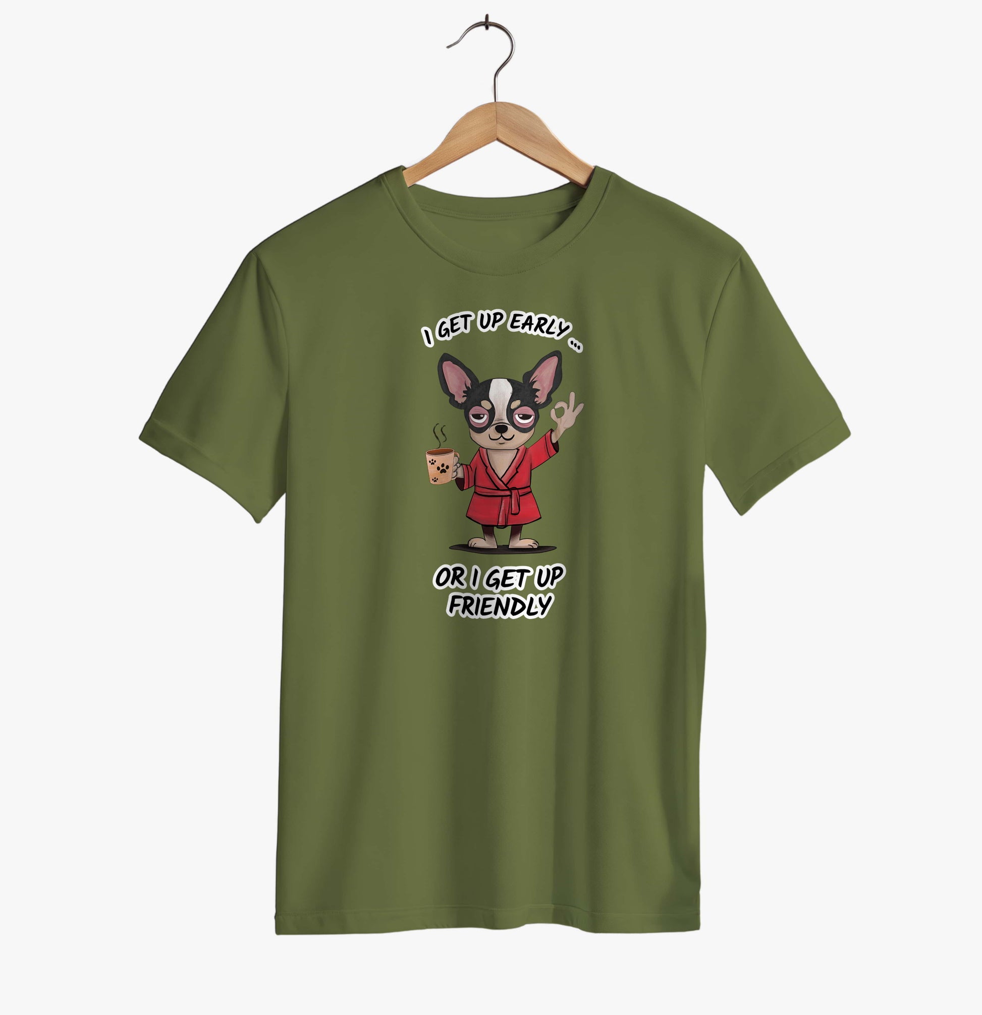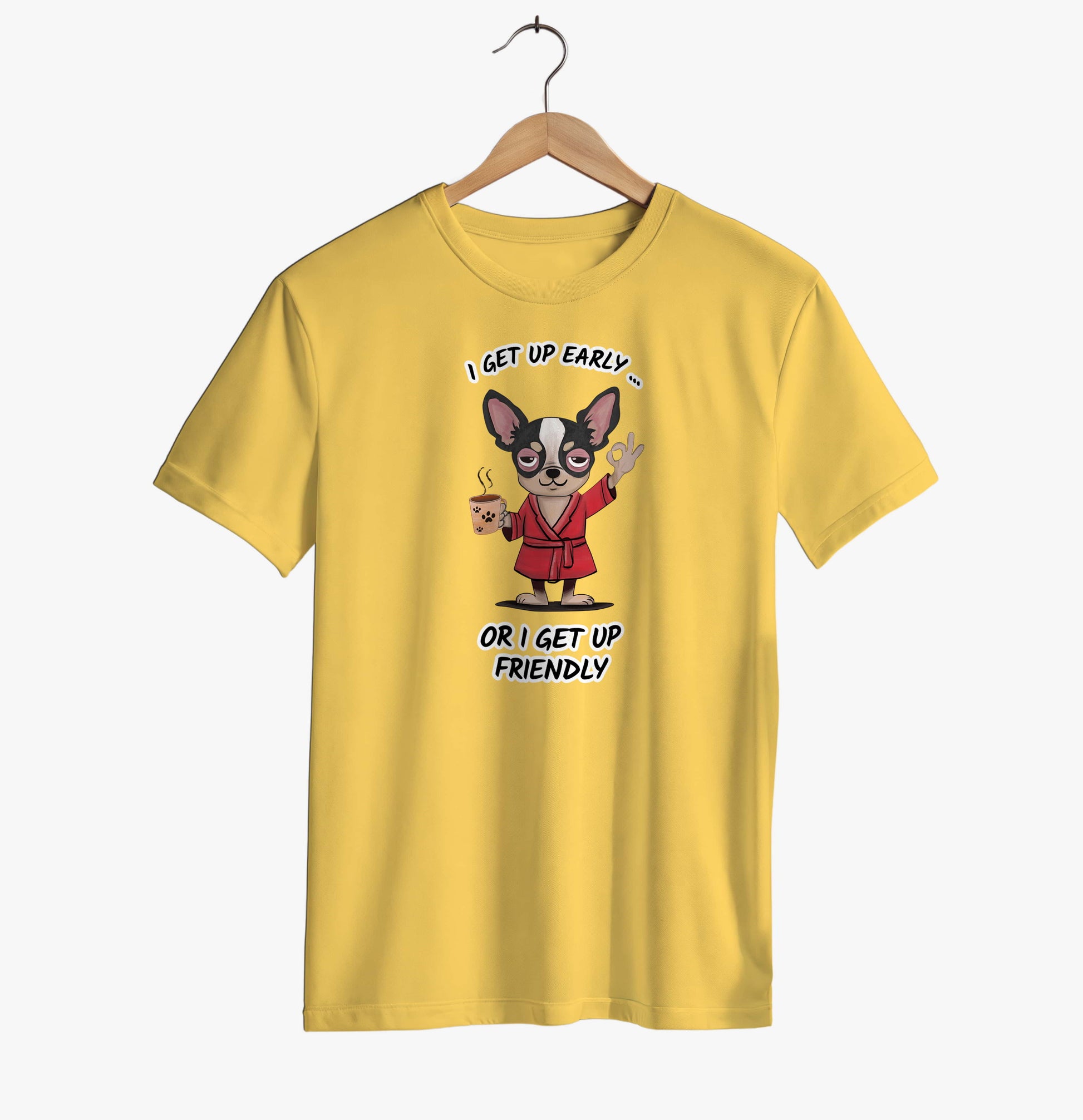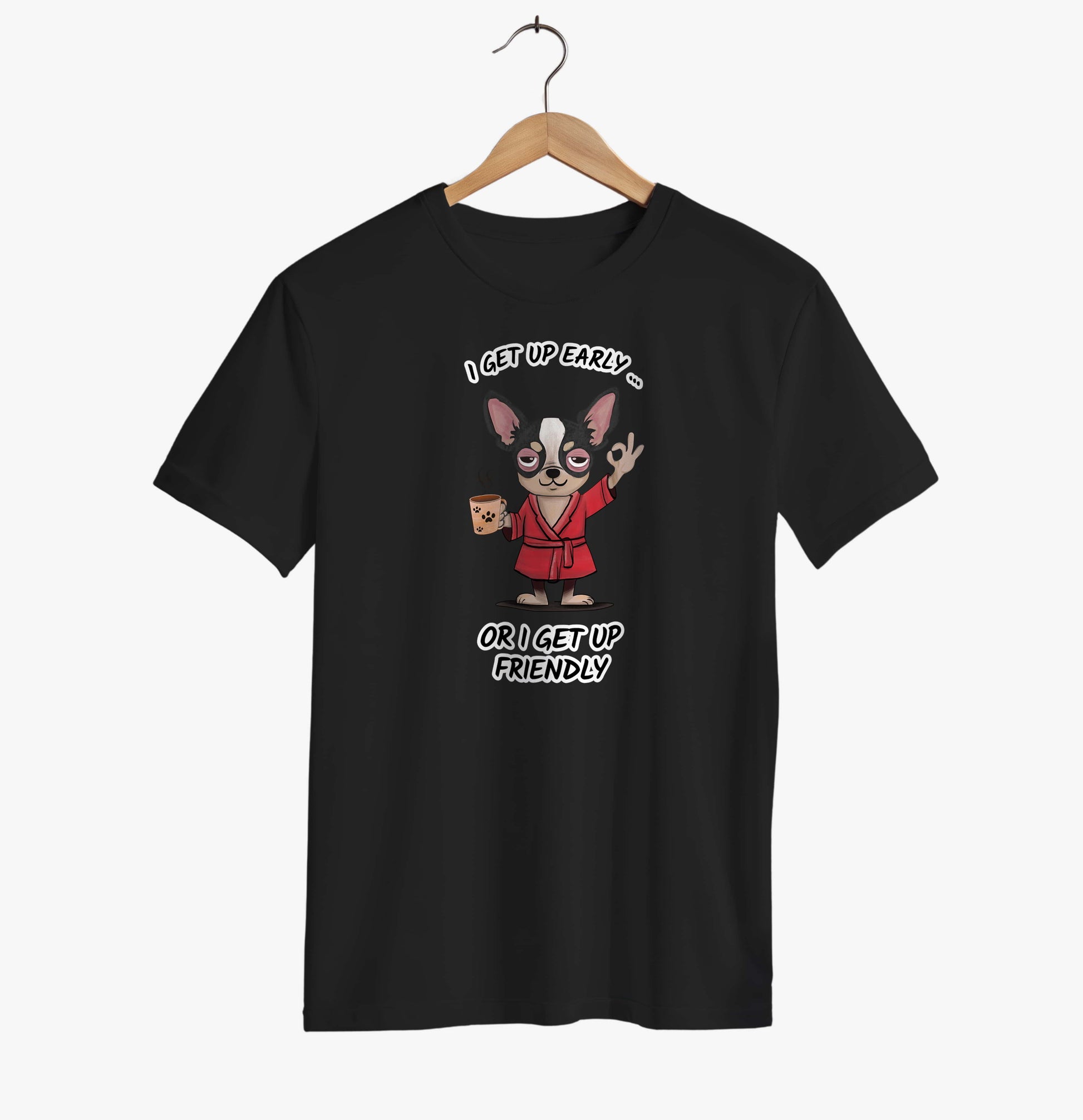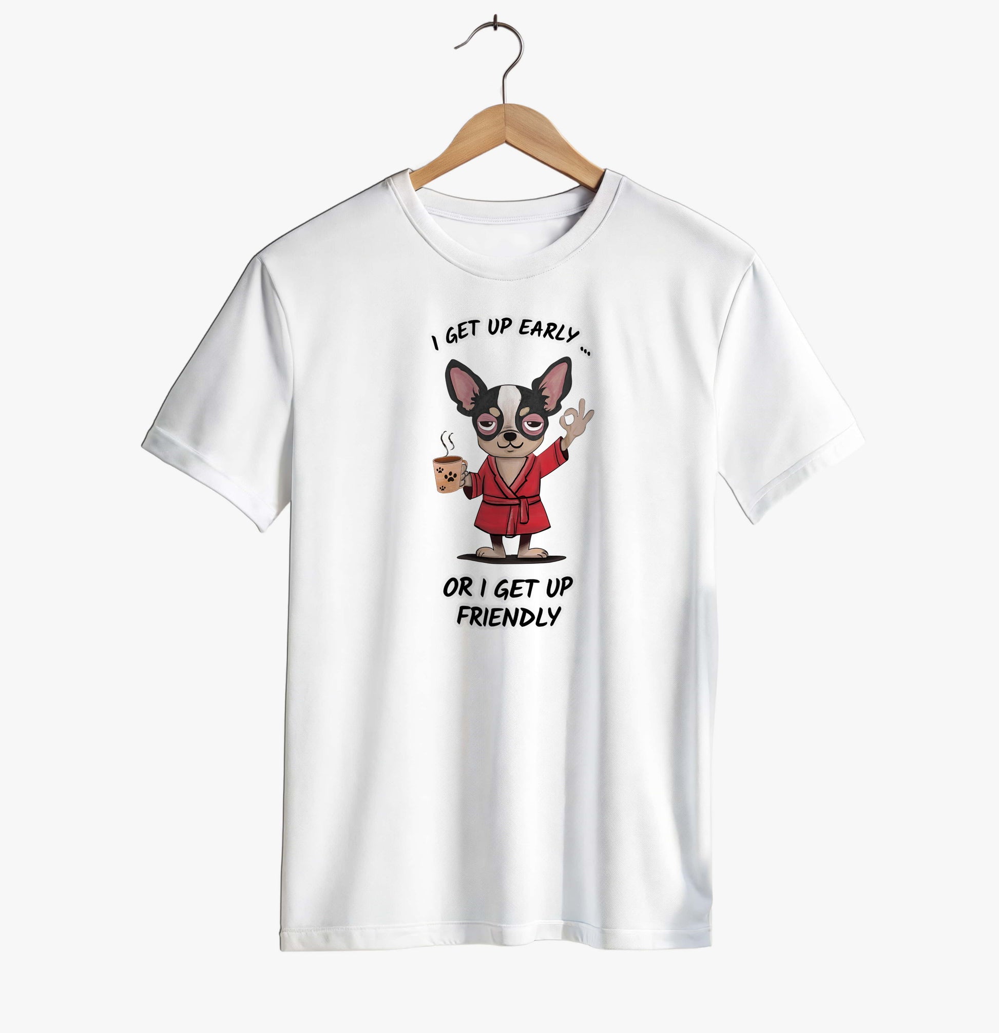 This unisex T-shirt features a sleepy, grumpy dog in a robe holding a morning coffee, paired with the humorous quote “I get up early… or I get up friendly.” Perfect for dog lovers who can’t function without caffeine and enjoy expressive, fun artwork.