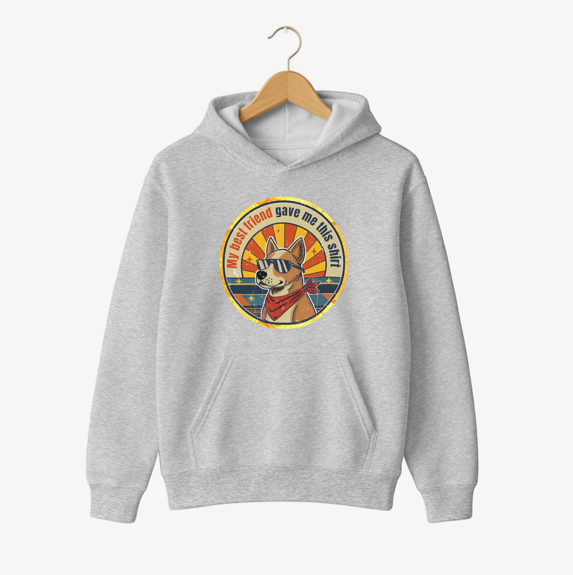 This unisex hoodie showcases a retro-inspired dog illustration with sunglasses and the message “My best friend gave me this shirt.” Warm vintage tones and a bold circular layout give this hoodie a relaxed, confident streetwear feel. Designed for dog lovers who proudly wear their bond with their best friend — a cosy standout piece from Woof2Be.