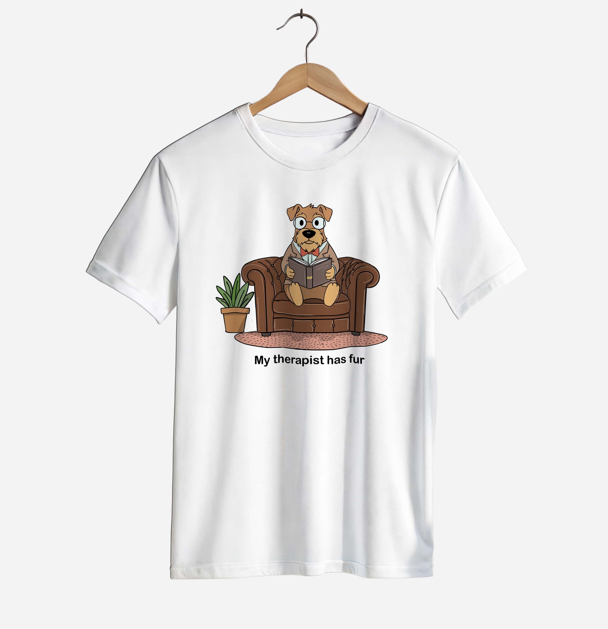 This unisex T-shirt features a charming illustration of a thoughtful dog sitting in an armchair and reading a book, paired with the witty phrase “My therapist has fur”. Designed for dog lovers who know that comfort, calm, and emotional support often come with four legs and a wagging tail. A perfect mix of humor, warmth, and everyday relatability.