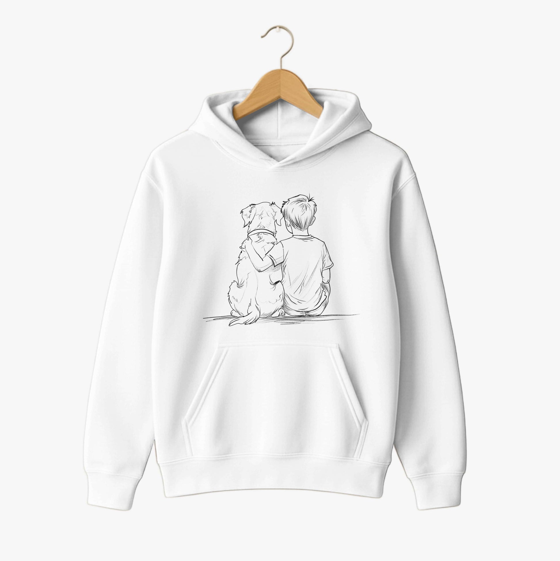 This unisex hoodie presents a minimalist line art illustration of a boy and his dog sitting together in silence. Designed with clean contours and no colour, it embodies calm, trust, and timeless companionship. A perfect choice for those who value simplicity, subtle emotion, and understated design.