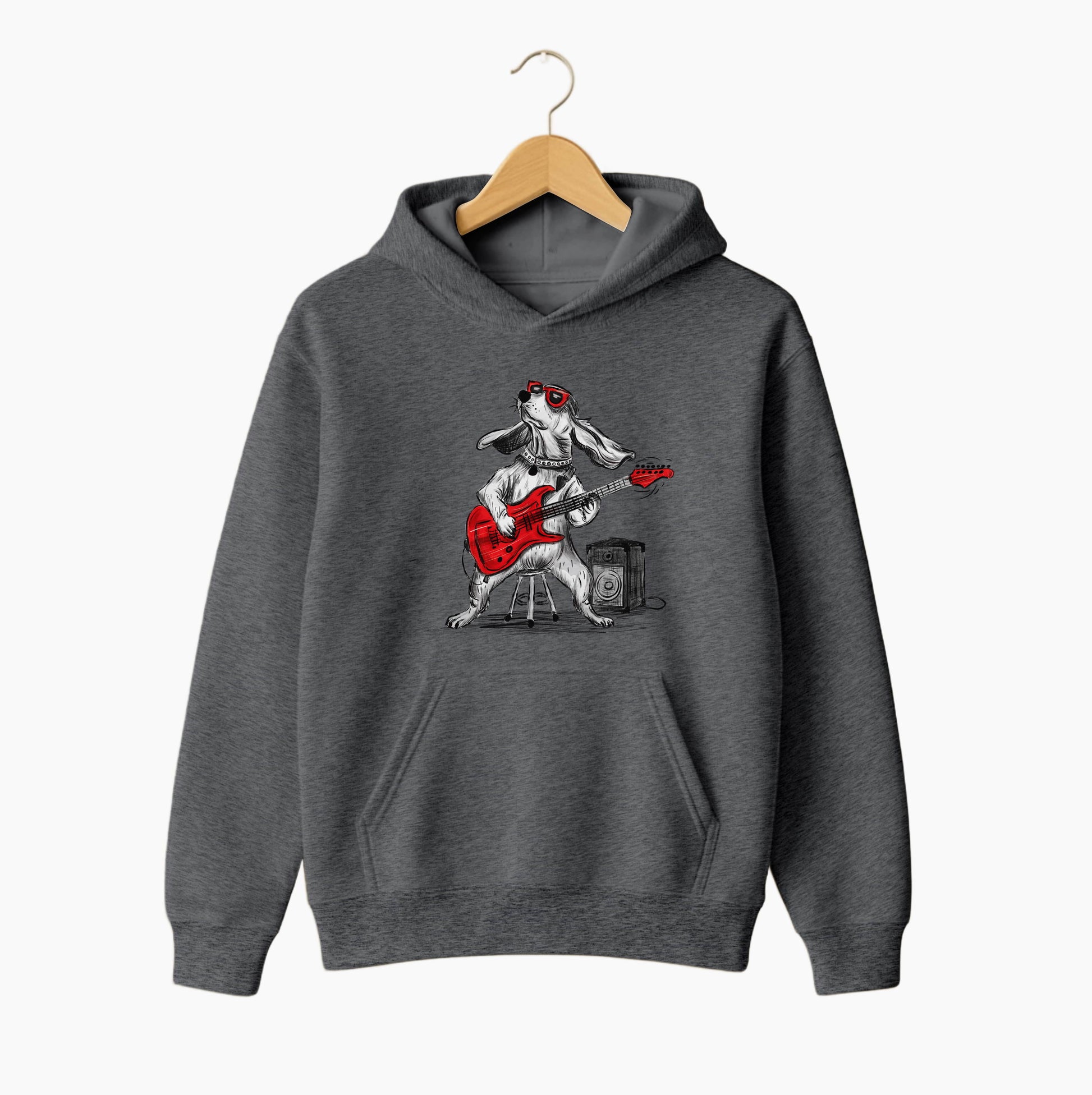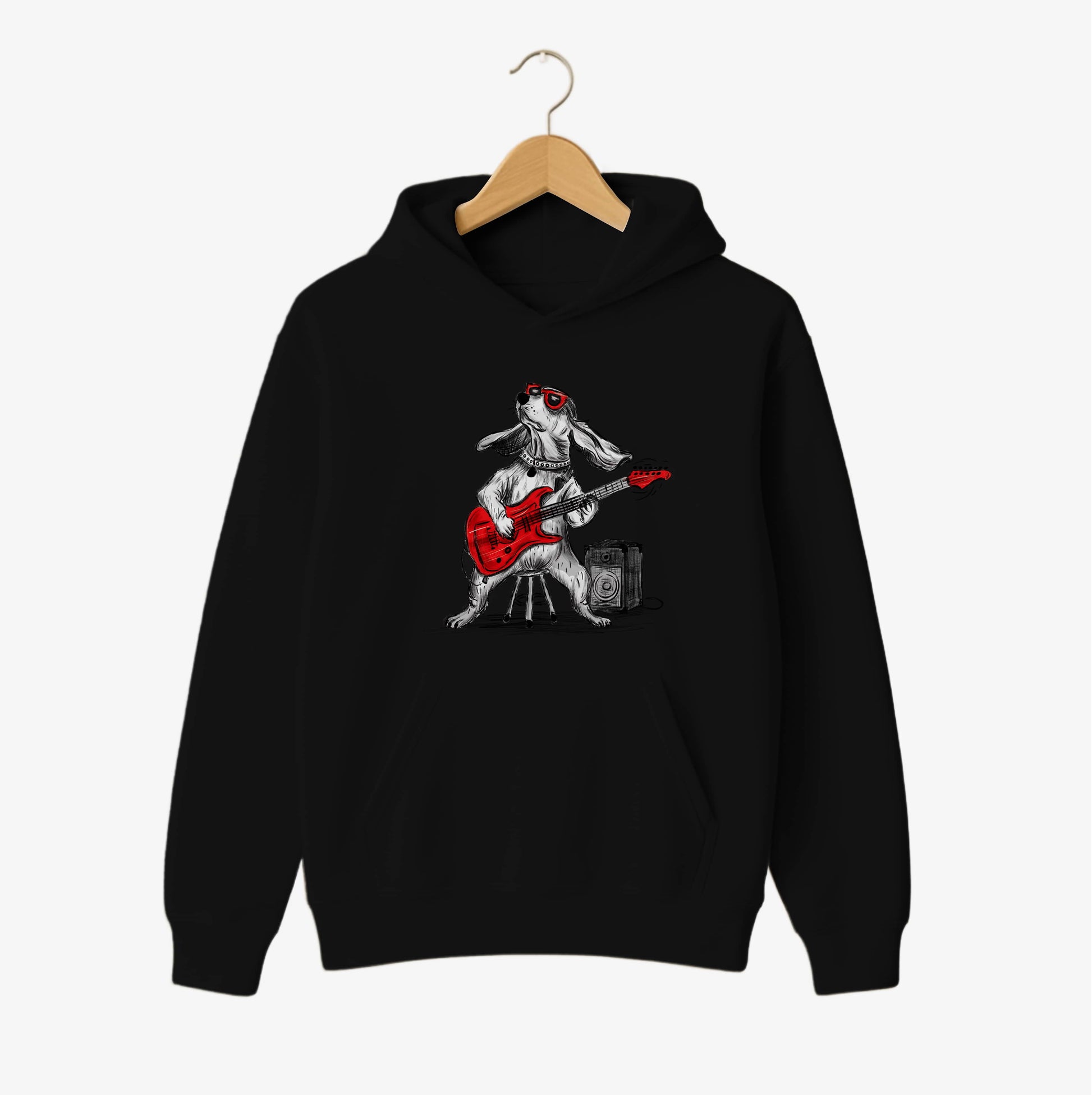 This unisex hoodie showcases a stylish dog playing electric guitar, captured in an expressive sketch style with bold red highlights. It's warm, eye-catching and perfect for anyone who loves dogs, music and unique illustrated designs. A standout piece for casual outfits and creative personalities.