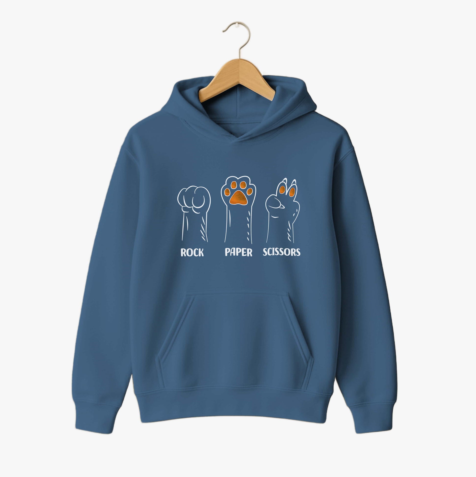 This unisex hoodie showcases a minimalist Rock, Paper, Scissors dog paw design with crisp white outlines and a warm paw detail. Clean, modern and playful without being loud — perfect for relaxed streetwear and dog lovers who appreciate simple, clever graphics. A cosy essential from Woof2Be.