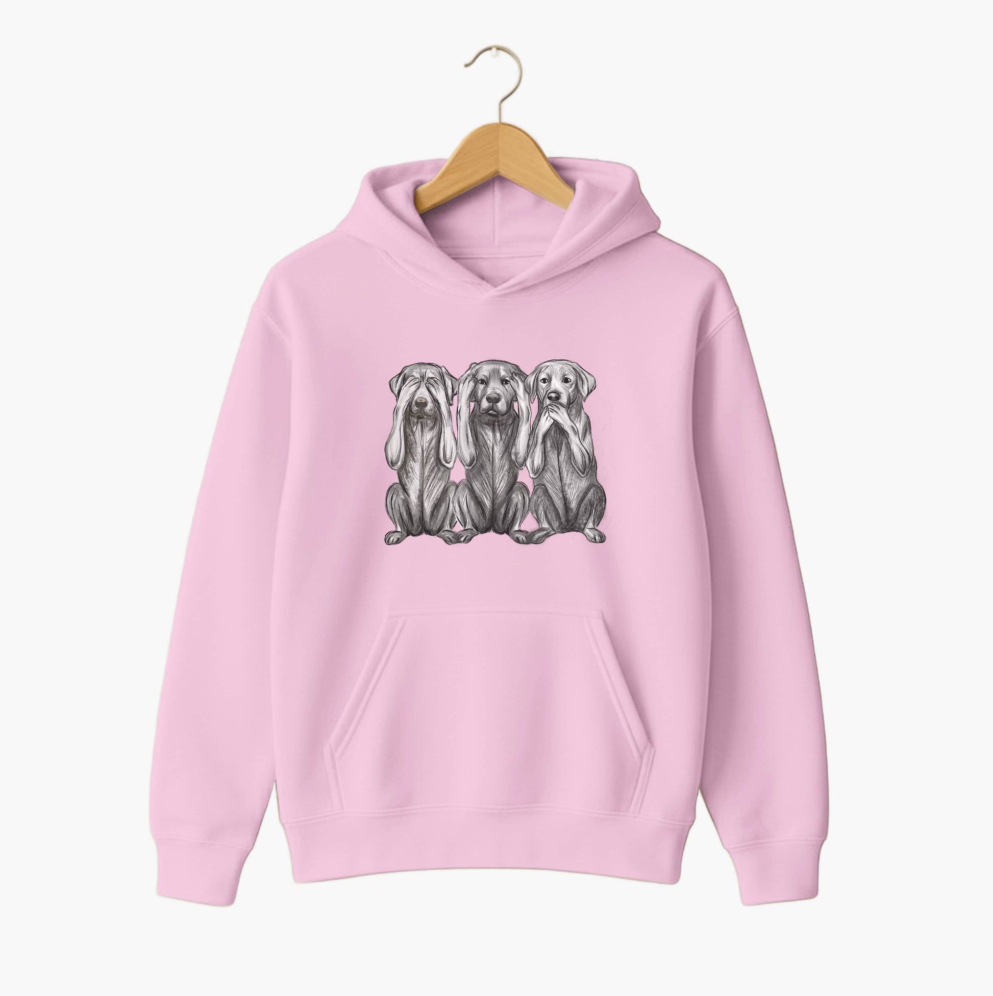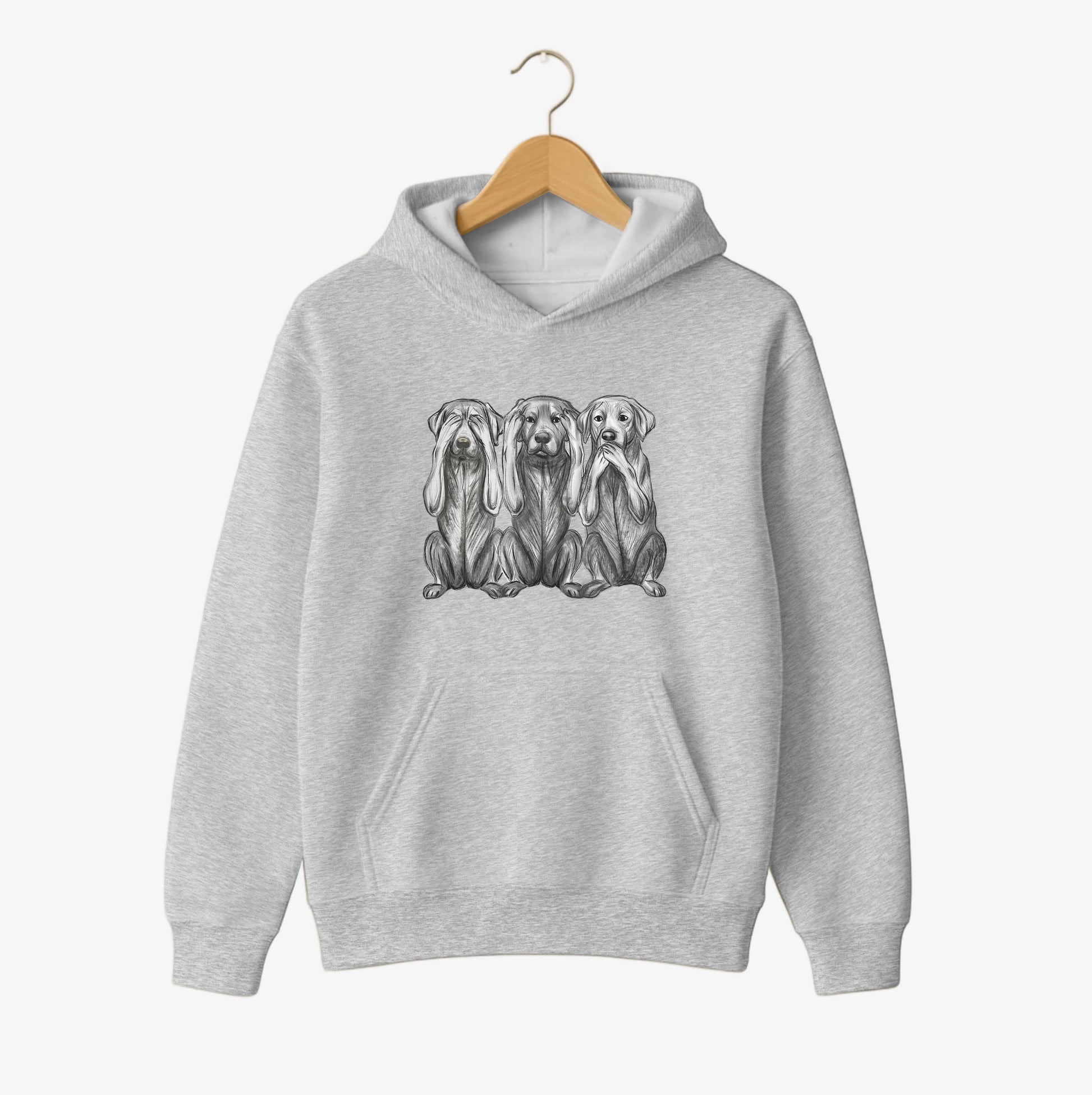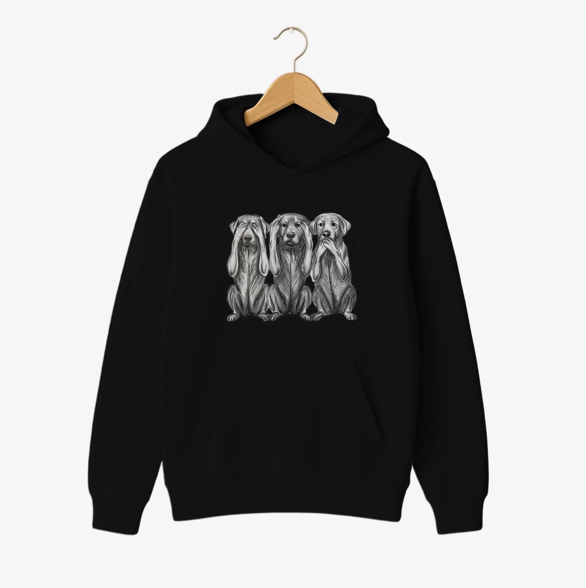 A warm, comfortable hoodie featuring a beautifully detailed monochrome illustration of three expressive pups in the “See No Evil, Hear No Evil, Speak No Evil” style. Clean, modern and effortlessly stylish — perfect for everyday wear.