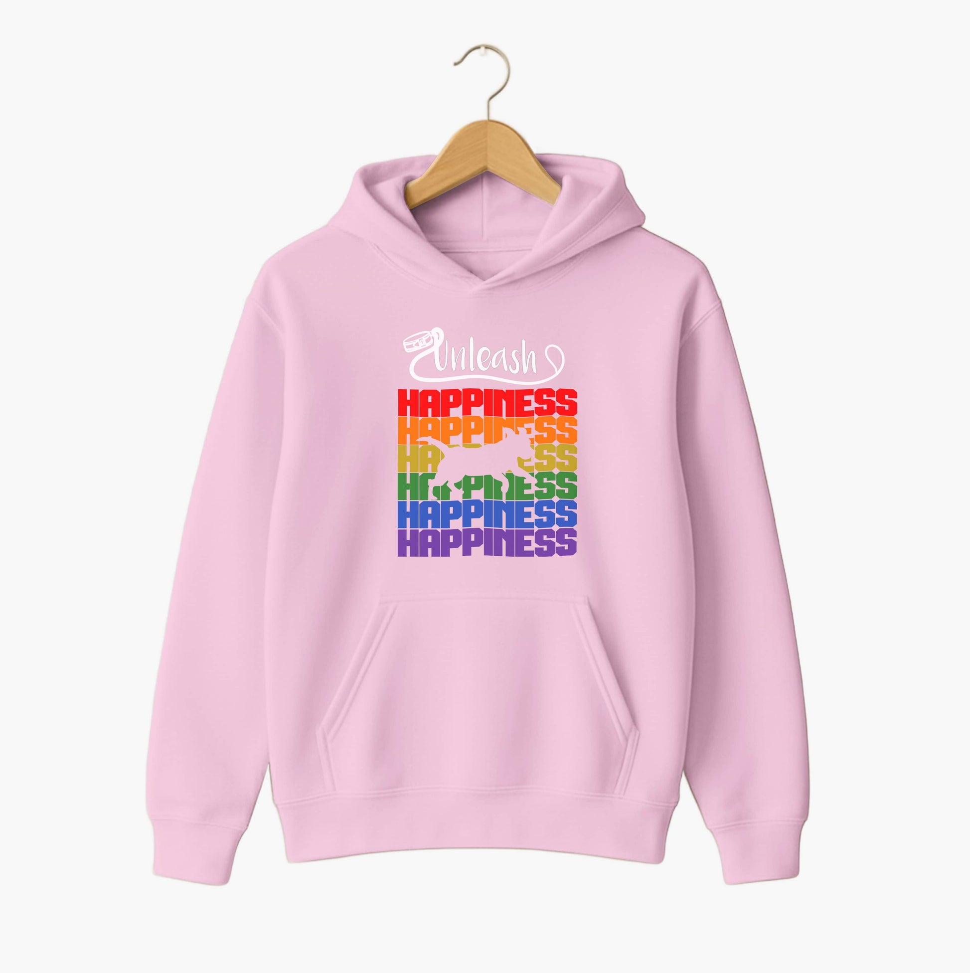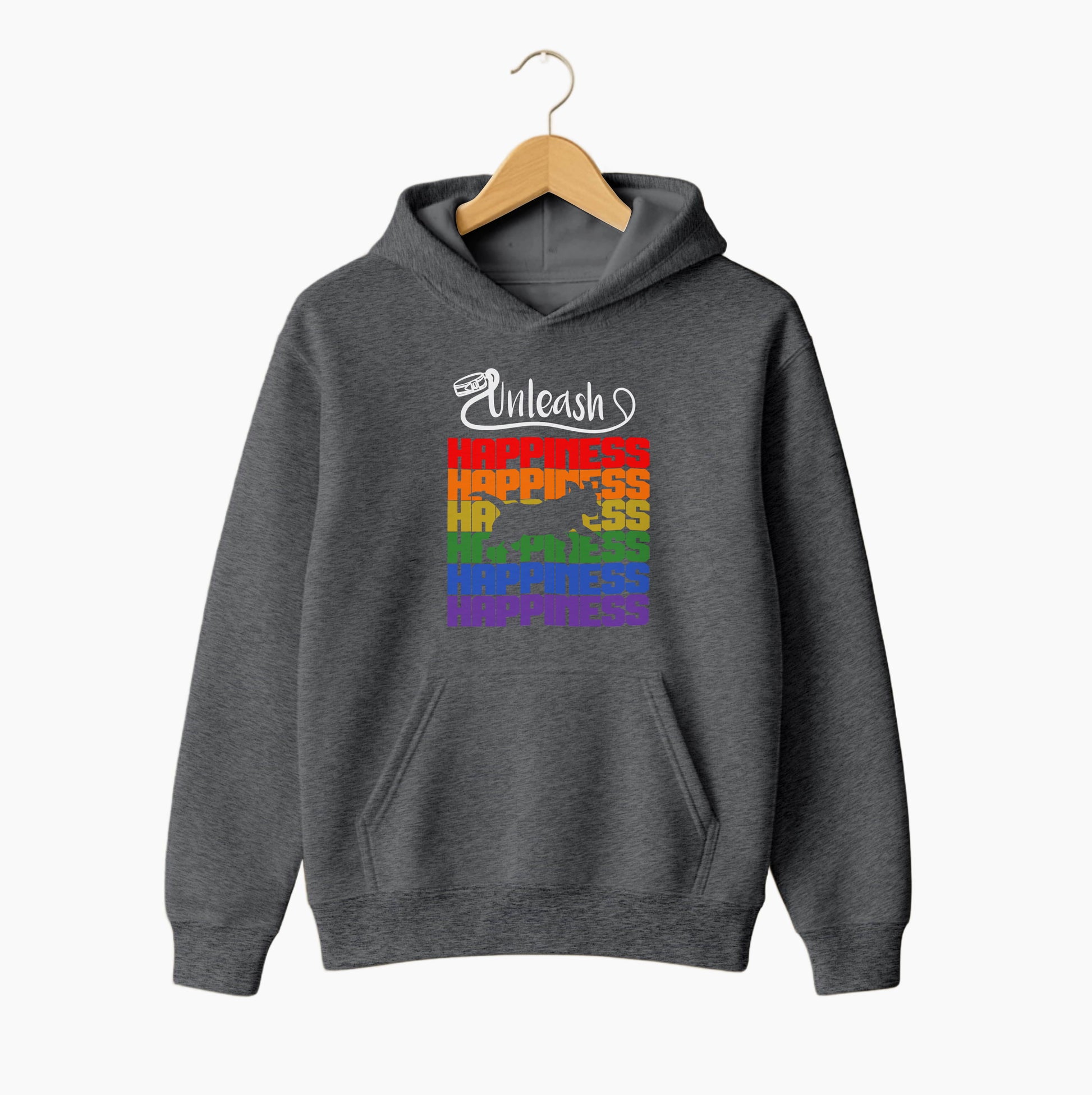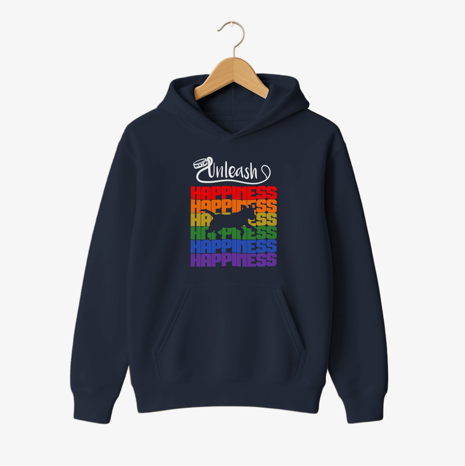 This unisex hoodie brings colour, comfort, and positivity together in one standout piece. The stacked rainbow “HAPPINESS” typography paired with a dog silhouette cut-out creates a bold, expressive design that radiates good vibes. Soft, warm, and perfect for daily wear, it’s the ideal choice for dog lovers who want to spread happiness wherever they go.